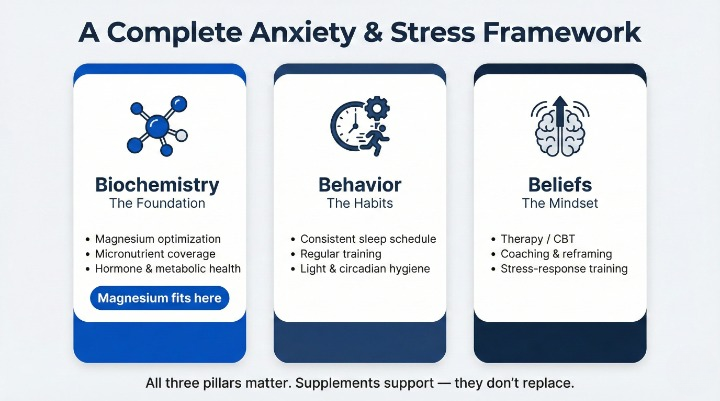 Think of magnesium like this: a biochemical foundation for a calmer nervous system, layered underneath habits, therapy/coaching, and (when needed) prescription care.