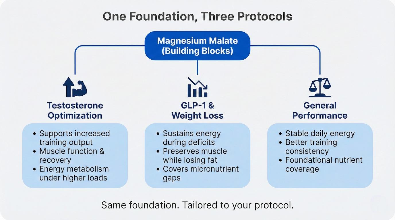 In Building Blocks, magnesium malate works alongside other core nutrients to create a reliable base—so your training, sleep habits, and medical protocols aren’t built on nutritional gaps.