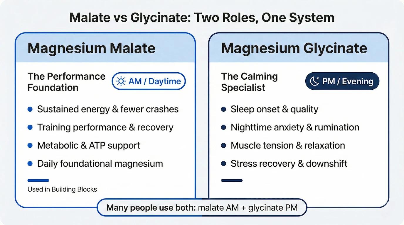 If sleep is a priority, it’s common to use malate as your daytime base and then discuss with your clinician whether a small evening glycinate dose makes sense.