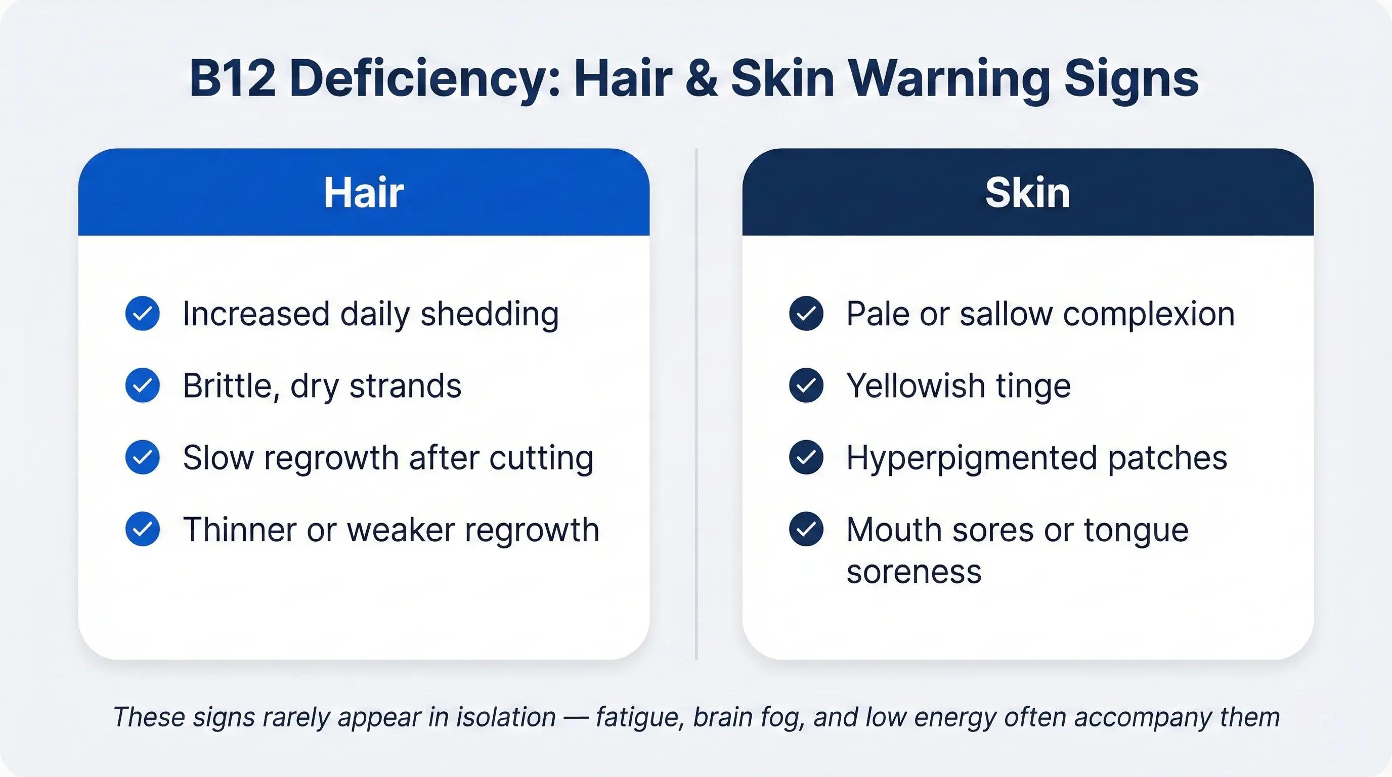 True B12 deficiency can show up as increased shedding, brittle hair, slow regrowth, and pale or inflamed skin — especially in vegans, older adults, and people on certain medications.