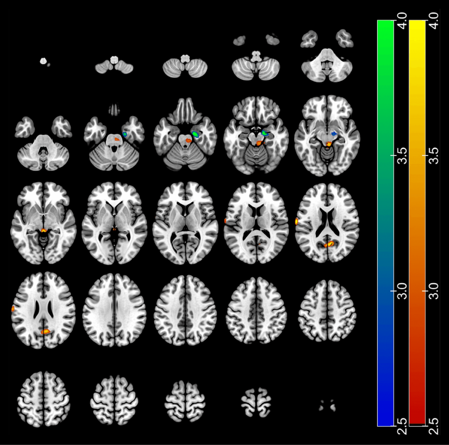 Changes in Regional Cerebral Blood Flow at 8 weeks with Daily Tadalafil The red-yellow color indicates the increase in the follow-up versus at baseline, while the blue-green color indicates a decrease in the follow-up versus at baseline